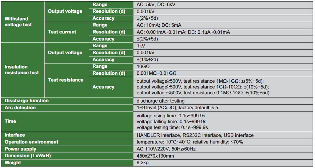 Time voltage rising time: 0.1s~999.9s;  voltage falling time: 0.1s~999.9s;  voltage testing time: 0.1s~999.9s