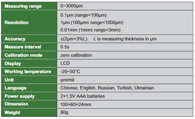 • Can quickly detect the paint thickness of iron and aluminum body of car, three colors of backlight indication