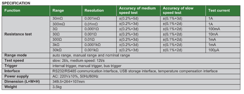Resistance test 30mΩ 0.001mΩ ±(0.2%+5d) ±(0.1%+3d) 1A