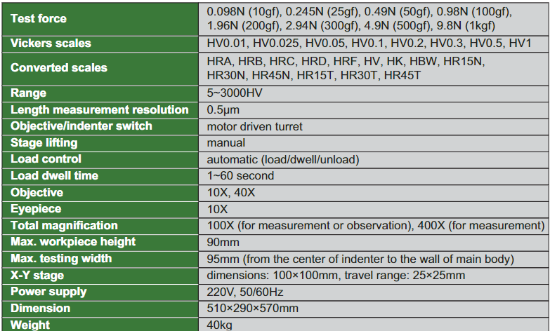 Test force 0.098N (10gf), 0.245N (25gf), 0.49N (5090, 0.98N (10090,1.96N (200gf), 2.94N (300gf), 4.9N (50090, 9.8N (Ikgf)