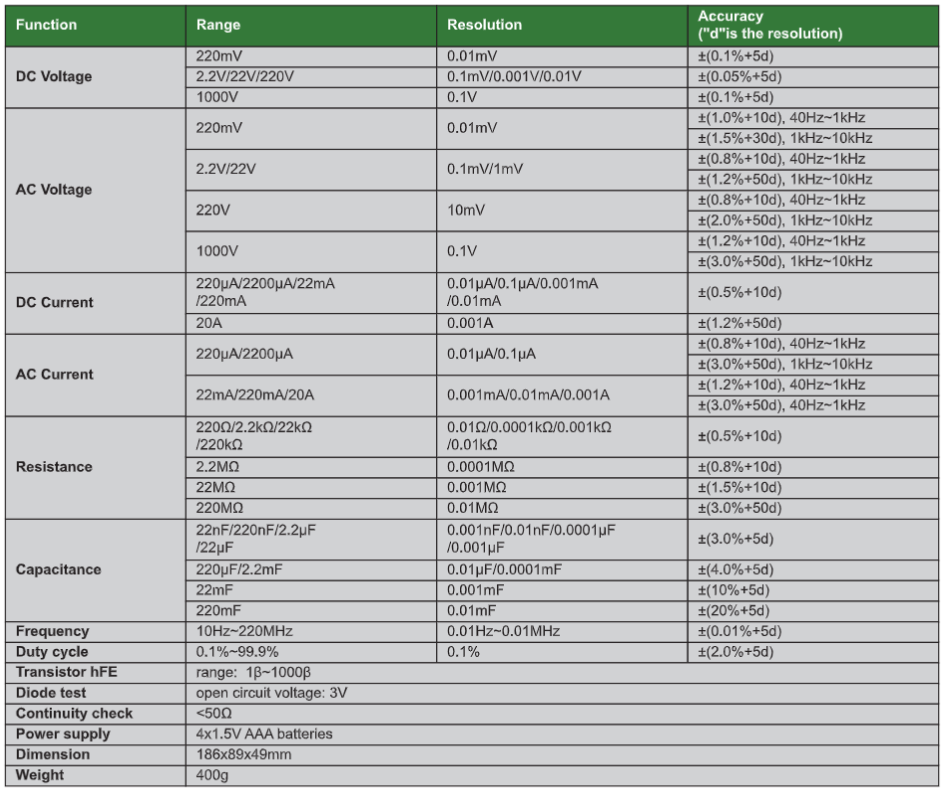 22mA/220mA/20A 0.001mA/0.01mA/0.001A ±(1.2%+10d), 40Hz~1kHz