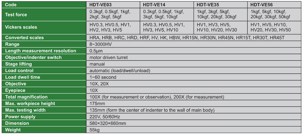 Test force 0.3kgf 0.5kgf 1kgf 2kgf 3kgf 5kgf 0.3kgf 0.5kgf 1kgf 3kgf 5kgf 10kgf 1kgf 3kgf 5kgf 10kgf 20kgf 30kgf 1kgf 5kgf 10kgf 20kgf 30kgf 50kgf