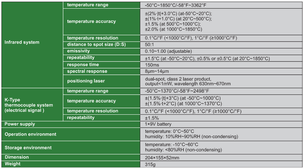 thermocouple temperature accuracy ±(1.5%-t+3°C) (at 50°C~100°C)