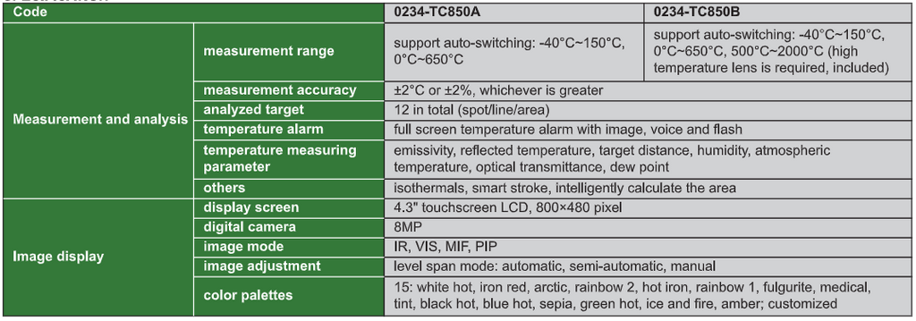 Measurement and analysis measurement range support auto-switching: -40°C150°C, 0°C650°C support auto-switching: -40°C150°C, 0°C650°C, 500°C~2000°C (high temperature lens is required, included)