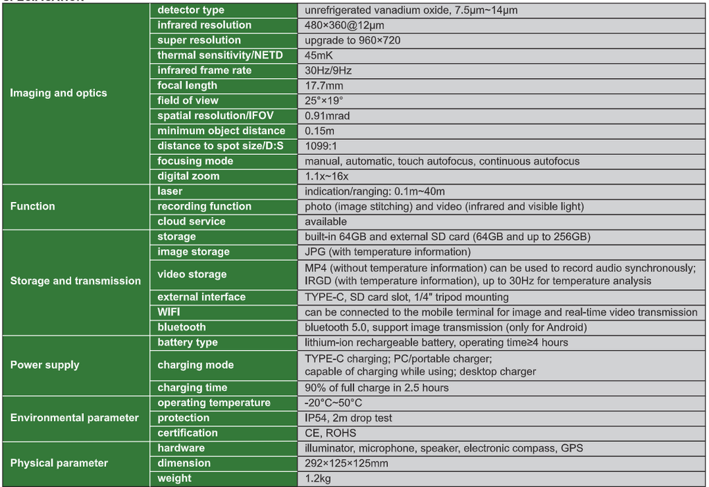video storage MP4 (without temperature information) can be used to record audio synchronously; IRGD (with temperature information), up to 30Hz for temperature analysis