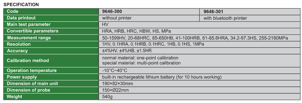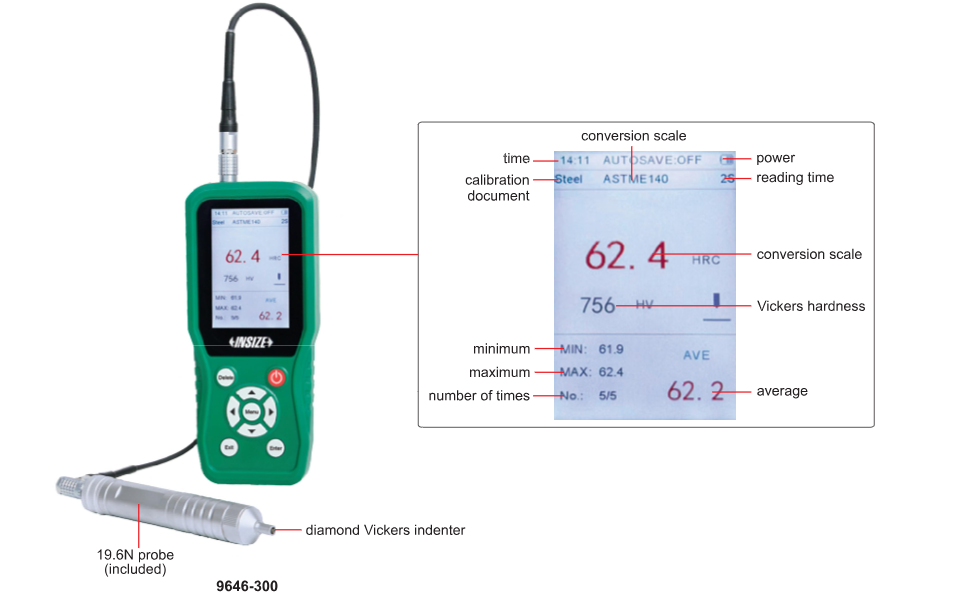 Measurement range 50-1599HV 20-68HRC 85-650HB 41-100HRB 61-85.6HRA 34.2-97.3HS 255-2180MPa