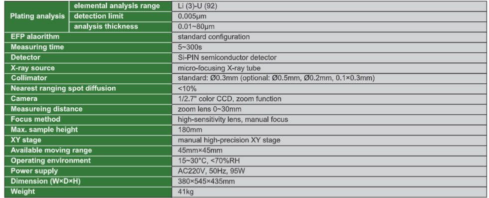• Application fields: electroplating plating thickness analysis, inspection of electronic components such as connectors, fastener industry, automotive parts, hardware industry (household equipment and accessories, such as Cr/Ni/CuZn(ABS)), new energy industry (photovoltaic welding wire, etc.), thickness analysis of accessories, Ni/Cu/Ni/NdFeB on rubidium iron boron magnets, metal cation detection in electroplating solution, etc.